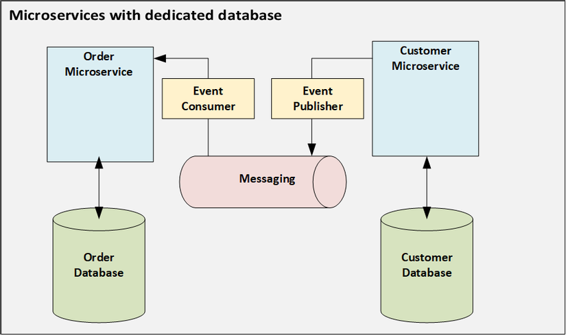 Order service và Customer service, mặc dù chạy trong những containers riêng biệt, có thể truy cập các tables từ cùng một cơ sở dữ liệu. Điều này sẽ tận dụng các transactions thích hợp với các thuộc tính ACID, nơi dữ liệu customer được cập nhật. Dữ liệu Order cũng có thể được cập nhật để đảm bảo sự toàn vẹn của dữ liệu.