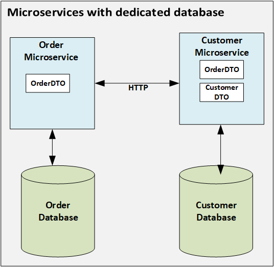 Order microservice truy cập cơ sở dữ liệu Order và Customer microservice truy cập cơ sở dữ liệu Customer.