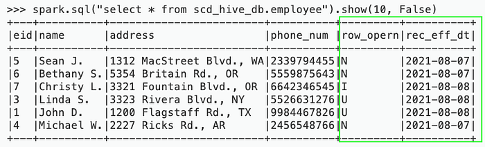 SCD_Cols: List of columns to be used for auditing, ex: rec_eff_dt, row_opern. - Calculate MD5 hash of incoming data and compare it against the MD5 hash of existing data to determine Updated(U) and No Change(N) records.